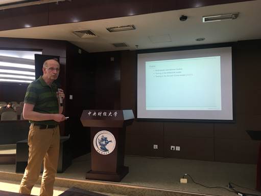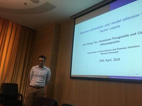 2018年4月25日,Anastasios Panagiotelis 在学术会堂603报告厅作了题为“Bayesian Inference forthe One-Factor Copula Model”的学术报告。Panagiotelis教授的报告内容是单因子Copula模型的贝叶斯推断方法。他首先介绍了单因子Copula模型,并重点讨论了因子Copula框架中需要重点解决的两个问题:一是对潜在因子的推断,二是模型选择问题。其次详细讲解了利用RJMCMC进行贝叶斯模型估计的公式,并展示了所提出的用于模型估计的抽样算法的性能。最后给出了单因子copula模型对东帝汶贫困数据的应用实例。讨论交流和提问环节,在场师生就Copula模型选择、MCMC的实现过程以及细节等问题与Panagiotelis教授进行了深入交流和讨论。